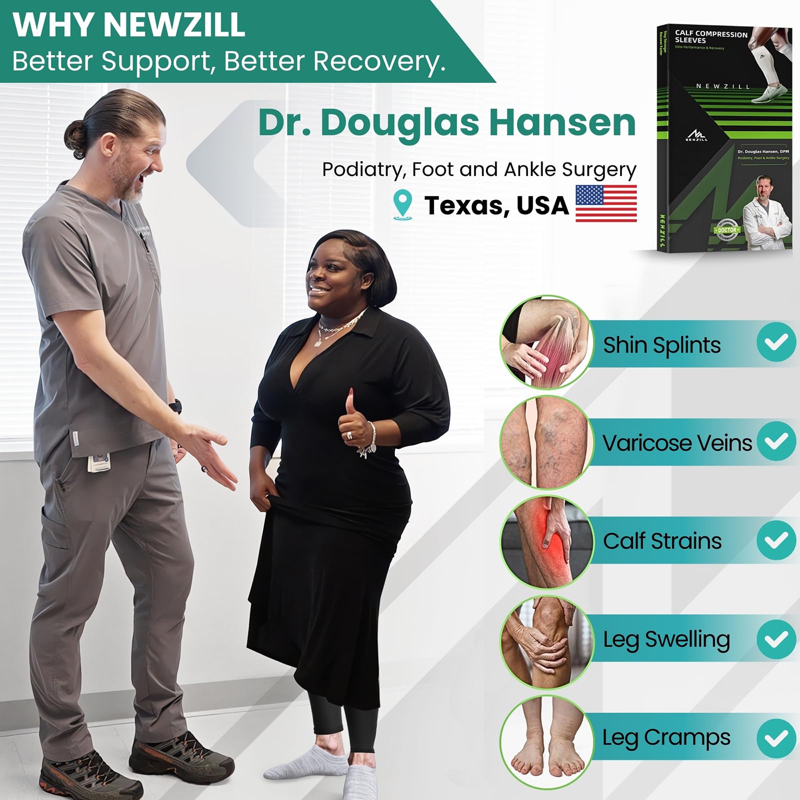 NEWZILL compression socks offer targeted support for Shin Splints, Varicose Veins, Calf Strains, Leg Cramps, and Leg Swelling. Endorsed by Dr. Douglas Hansen, a leading Podiatric Medicine and Foot Surgeon in Texas, USA.