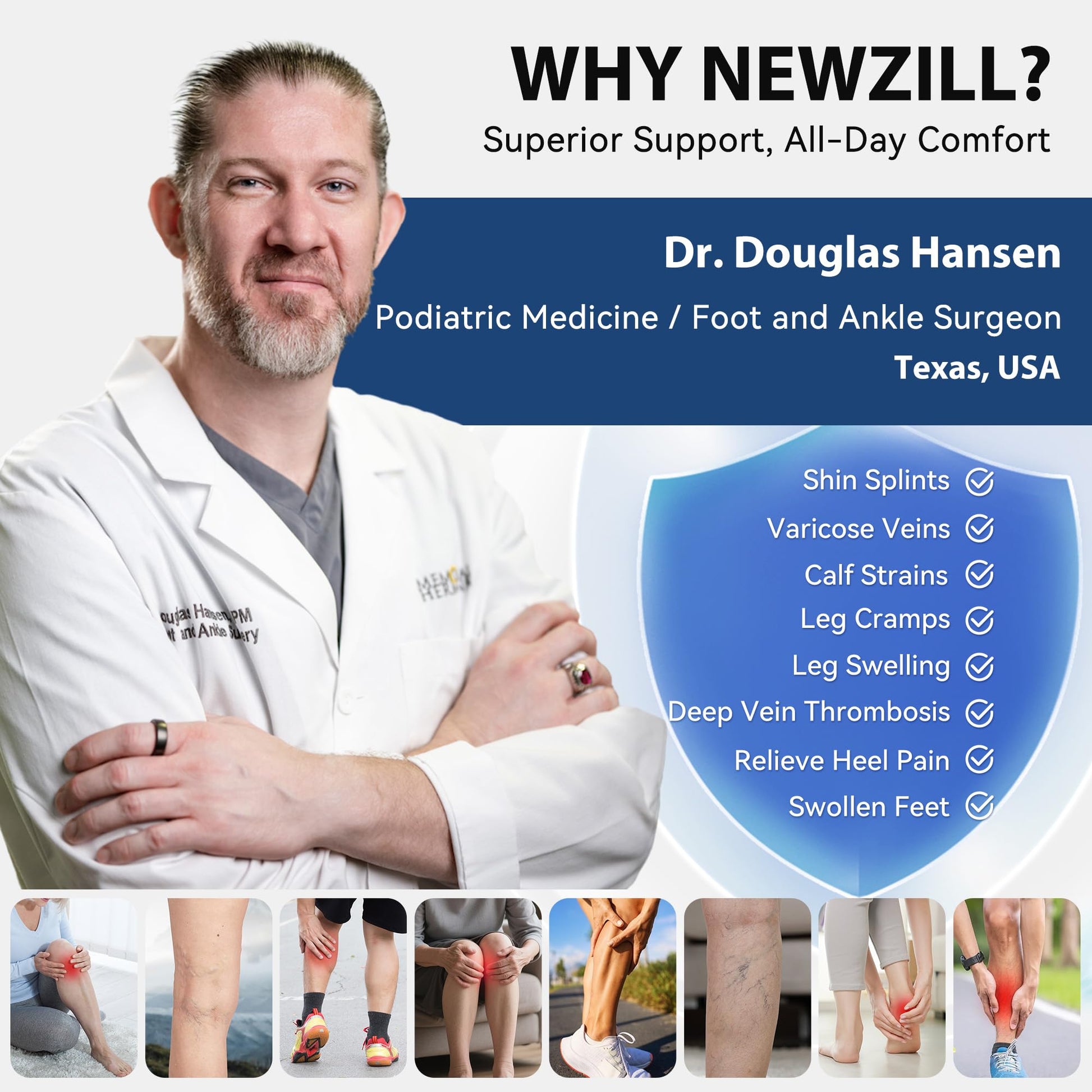 NEWZILL compression socks offer targeted support for Shin Splints, Varicose Veins, Calf Strains, Leg Cramps, and Leg Swelling. Endorsed by Dr. Douglas Hansen, a leading Podiatric Medicine and Foot Surgeon in Texas, USA.